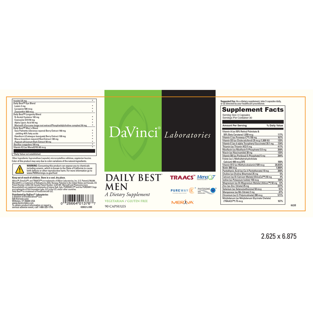 Daily Best™ Men is a comprehensive daily multiple vitamin/mineral supplement targeting the diverse needs unique to men. This formula features the core Daily Best™ vitamin/mineral and probiotic profile including active forms of B6, B12 and Quatrefolic® ((6S)-5-methylfolate, glucosamine salt). The Daily Best formula also includes the bioenhanced form of Vitamin C, Pureway C™ and the clinically validated form of Vitamin K2, MenaQ7®. Daily Best™ Men uses shelf stable probiotics for optimal digestive function. In addition, three key blends were included to provide unparalleled system specific support: