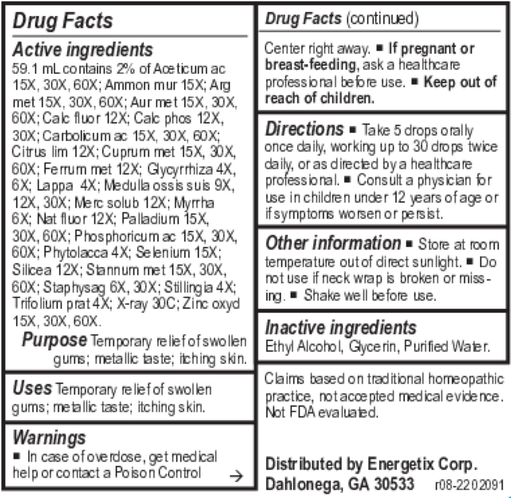 Active Ingredients: 59.1 mL contains 2% of Aceticum ac 15X, 30X, 60X; Ammon mur 15X; Arg met 15X, 30X, 60X; Aur met 15X, 30X, 60X; Calc fluor 12X; Calc phos 12X, 30X; Carbolicum ac 15X, 30X, 60X; Citrus lim 12X; Cuprum met 15X, 30X, 60X; Ferrum met 12X; Glycyrrhiza 4X, 6X; Lappa 4X; Medulla ossis suis 9X, 12X, 30X; Merc solub 12X; Myrrha 6X; Nat fluor 12X; Palladium 15X, 30X, 60X; Phosphoricum ac 15X, 30X, 60X; Phytolacca 4X; Selenium 15X; Silicea 12X; Stannum met 15X, 30X, 60X; Staphysag 6X, 30X; Stillingia 4X; Trifolium prat 4X; X-ray 30C; Zinc oxyd 15X, 30X, 60X.