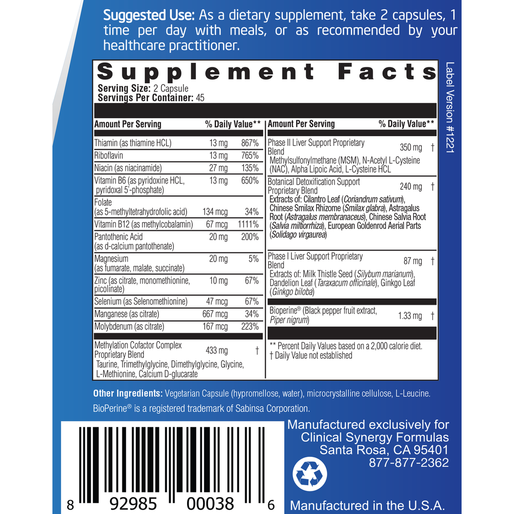 Detox Complete® combines botanical extracts, antioxidants, amino acids, B vitamins and other nutrients for a deep, total-body toxin removal. Research shows that supporting Phase I and II liver detoxification allows for the body to convert toxins, contained in organs and tissues, to water-soluble neutral compounds through methylation pathways and eliminate them from the body.*