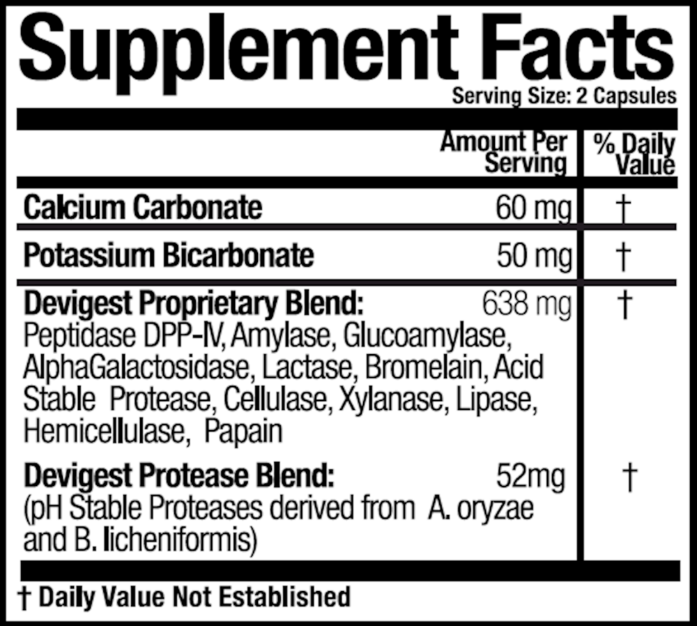 DEVIGEST ADS Advanced Digestive Support is the latest breakthrough in digestive enzyme science. DEVIGEST ADS is more powerful and concentrated than its predecessors. DEVIGEST ADS features a unique Dipeptyl Peptidase DPPIV enzyme that specifically targets gluten and casein. It has also been enhanced with a super concentrated protease blend that digests a wider array of proteins over a broader range of pH. A higher dose of lactase has been introduced to better assist with the digestion of dairy sugars. Lastly, alpha galactosidase has been added to support the digestion of gassy foods, decreasing the amount of flatulence, abdominal bloating and digestive discomfort. Just one capsule with meals can ease the digestion of even the most troublesome foods.