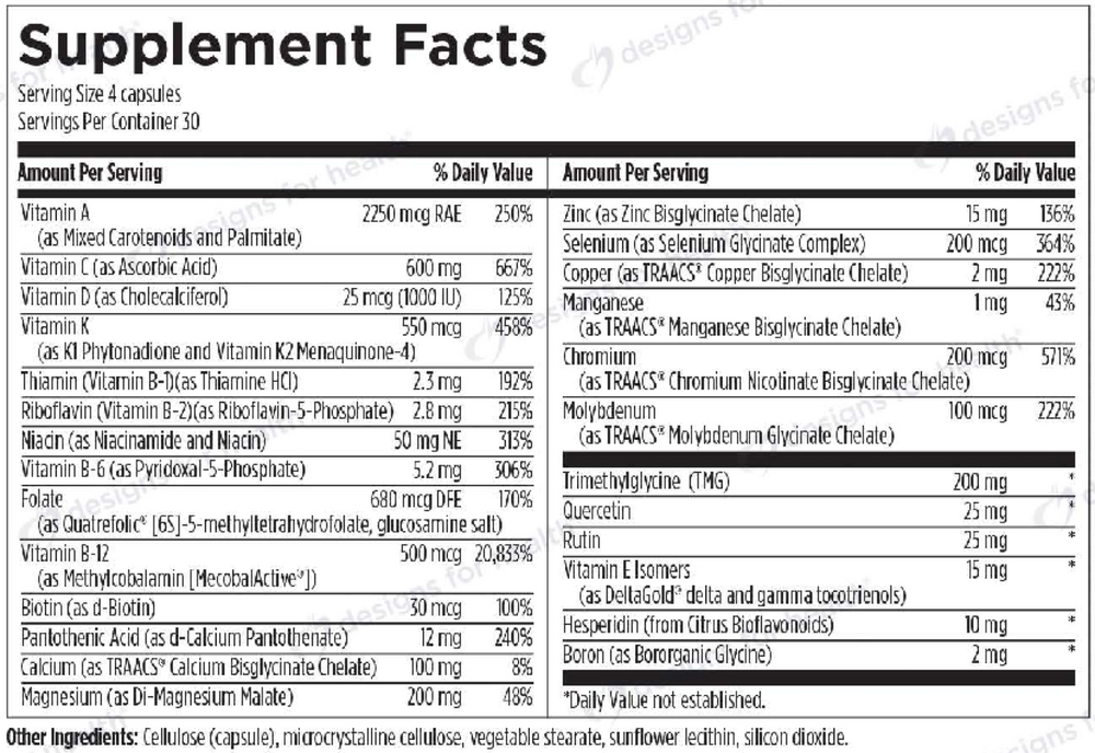 DFH Complete Multi™ with Copper is a full-spectrum multivitamin with Albion-chelated minerals for maximum absorption and bioavailability. This powerhouse multivitamin supplies supportive nutrients that are not normally found in regular multivitamins, such as delta- and gamma-tocotrienols, trimethylglycine (TMG), and fruit bioflavonoids. This formula also contains natural mixed carotenoids, a full spectrum of vitamin K forms, and levels of B vitamins, based on evolutionary intake of these nutrients that support healthy cell replication and are higher than recommended daily allowance/recommended dietary intake (RDA/RDI) values. This product contains 2 mg of copper, as copper glycinate chelate, a stabilized mineral chelate from Albion Minerals that reduces the risk of free copper in the body that can cause oxidative stress. This multivitamin is iron-free and iodine-free.