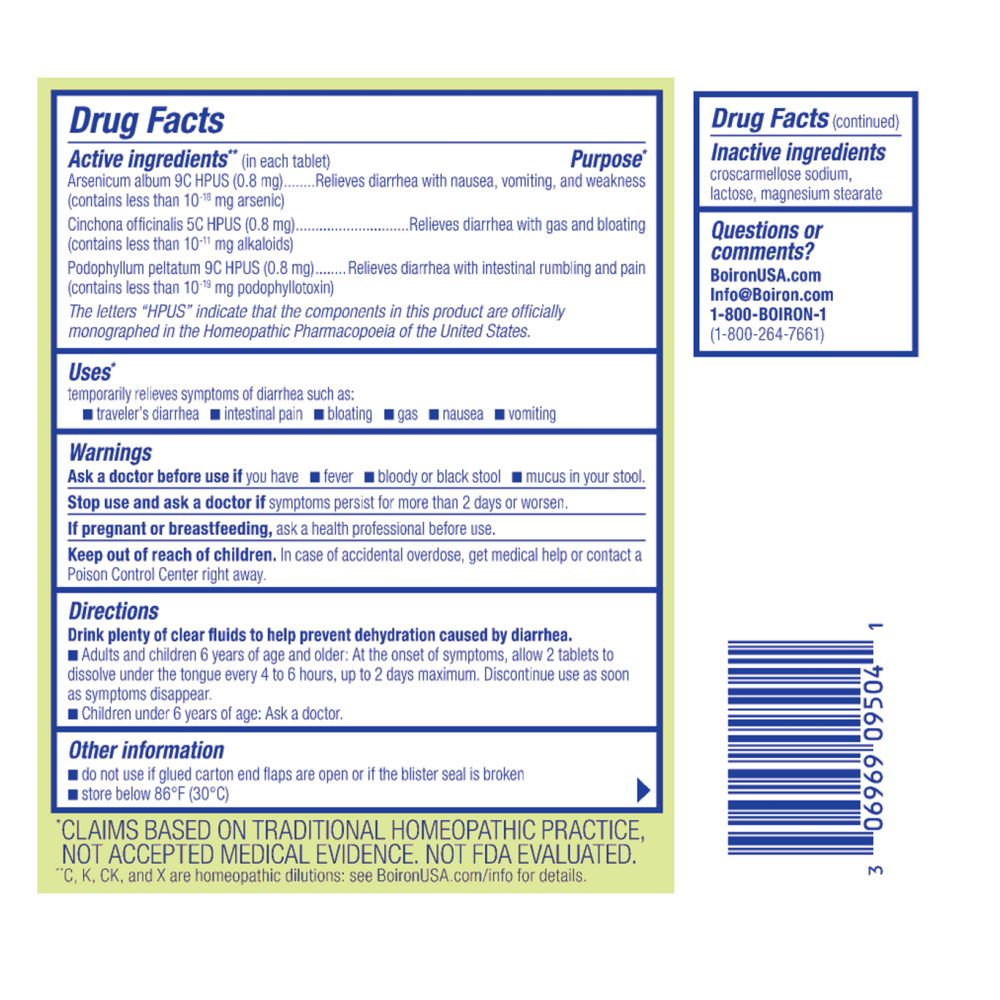 Diaralia Meltaway Tablets by Boiron melt in your mouth to relieve diarrhea and traveler's diarrhea with intestinal pain, bloating, gas, nausea, and vomiting.* Powered by plant-based and other pure active ingredients, this homeopathic diarrhea medicine works gently on the body without the risk of constipation, drowsiness, or stool discoloration common with other medications. It has no known drug interactions and is gluten-free with no artificial sweeteners, flavors, colors, or preservatives.Convenient and discreet, Diaralia is available over the counter in a box of 60 unflavored meltaway tablets for adults and children ages 6 and up. Boiron's digestive relief line also includes Acidil for heartburn and indigestion, Gasalia for gas and bloating, NauseaCalm for nausea and upset stomach, and Nux vomica for overindulgence.*Claims based on traditional homeopathic practice, not accepted medical evidence. Not FDA evaluated.