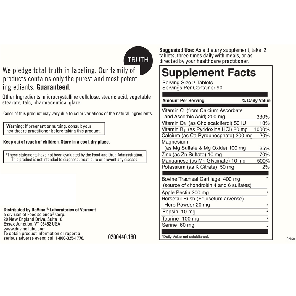 -A unique formulation of bovine tracheal cartilage and manganese with other supporting nutrients for spinal support.* Bovine tracheal cartilage is rich in two types of glycosaminoglycans, Chondroitin -4-and -6- Sulfates. They