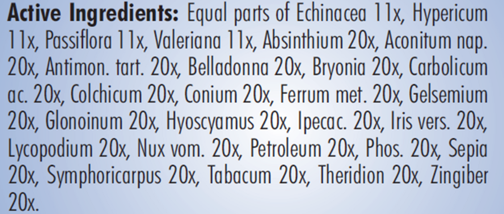 Equal parts of Echinacea 3x, Hypericum perforatum 3x, Passiflora incarnata 3x, Valeriana officinalis 3x, Echinacea 8x, Hypericum perforatum 8x, Passiflora incarnata 8x, Valeriana officinalis 8x, Absinthium 20x, Aconitum napellus 20x, Antimonium tartaricum 20x, Belladonna 20x, Bryonia 20x, Carbolicum acidum 20x, Colchicum autumnale 20x, Conium maculatum 20x, Ferrum metallicum 20x, Gelsemium sempervirens 20x, Glonoinum 20x, Hyoscyamus niger 20x, Ipecacuanha 20x, Iris versicolor 20x, Lycopodium clavatum 20x, Nux vomica 20x, Petroleum 20x, Phosphorus 20x, Sepia 20x, Symphoricarpus racemosus 20x, Tabacum 20x, Theridion 20x, Zingiber officinale 20x.