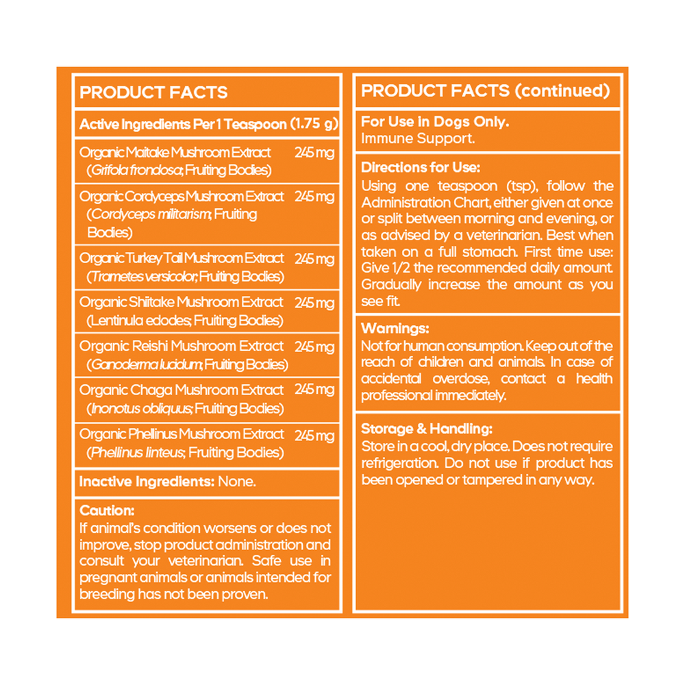 Codeage DNA PET Happy Immunity is a USDA-certified organic advanced dogs nutrition supplement offering a mix of 7 different organic mushroom species in a powder form. This DNA PET immunity boost formula support combines maitake, cordyceps, turkey tail, shiitake, reishi, chaga, and phellinus extracts in a certified organic mushroom complex formulated for dogs.