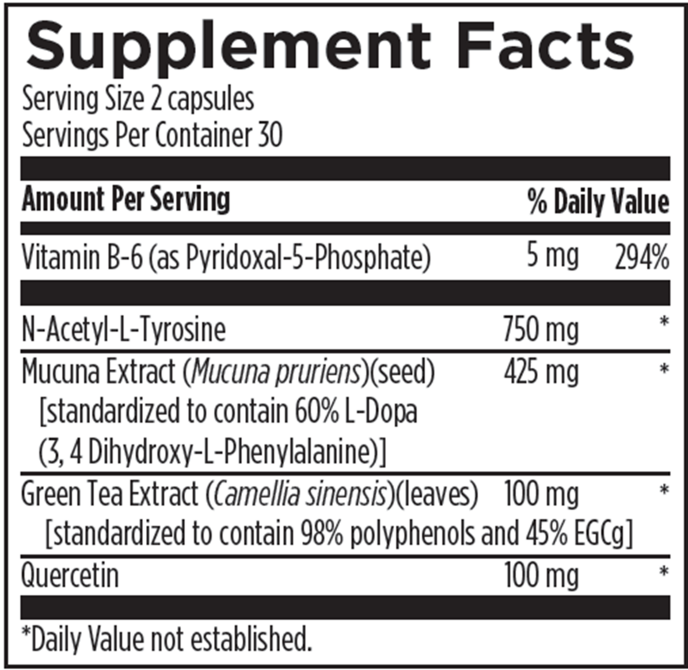 DopaBoost™ is designed to support the body’s natural production of dopamine, one of the body’s primary catecholamines. Dopamine is essential for the normal functioning of the central nervous system and is associated with attention, learning, movement, balance, and mood regulation.* The primary ingredient in DopaBoost™ is Mucuna pruriens, a botanical which naturally contains L-Dopa, the metabolic precursor to dopamine which can cross the blood-brain barrier. Additional ingredients include EGCg (epigallocatechin gallate), acetyl-L-tyrosine, quercetin and vitamin B6, all selected for their synergistic roles in the production and regulation of dopamine.*