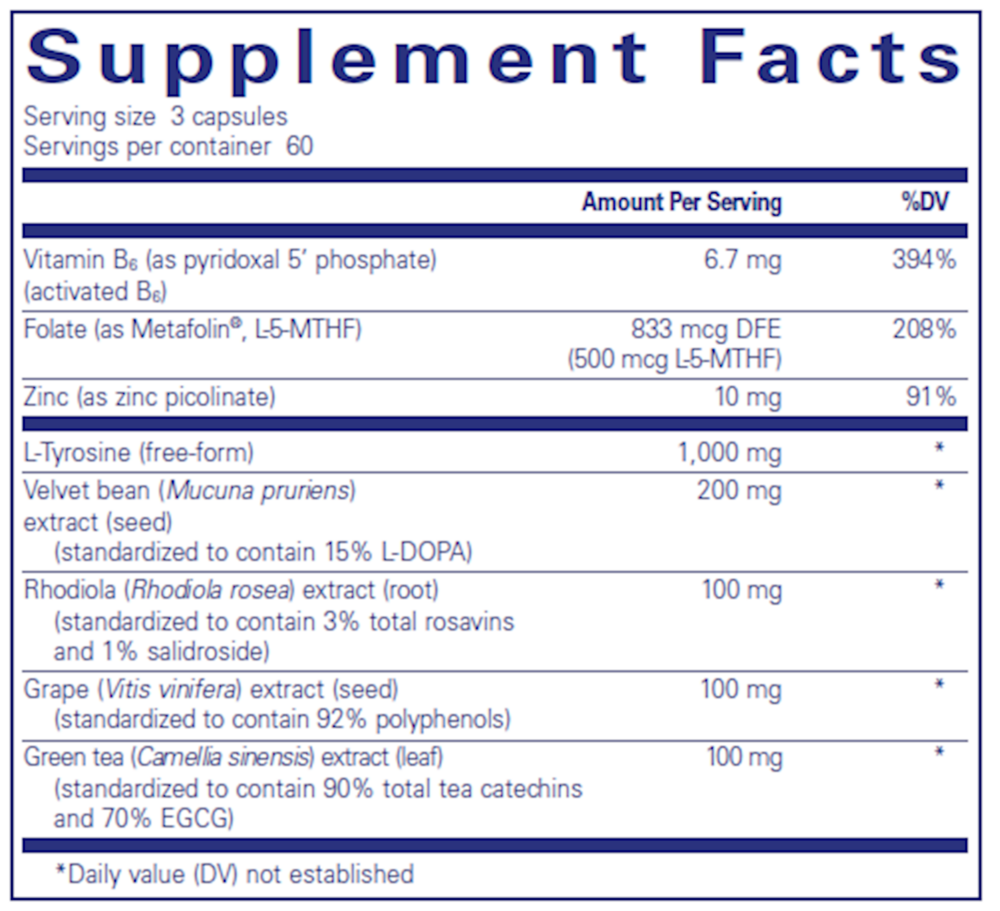 • Includes the cofactors vitamin B6, Metafolin® L-5-MTHF, and zinc to support dopamine production*