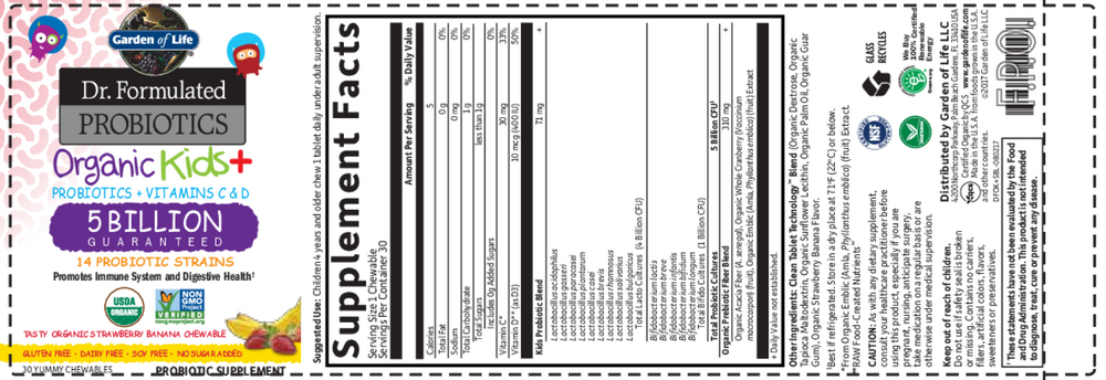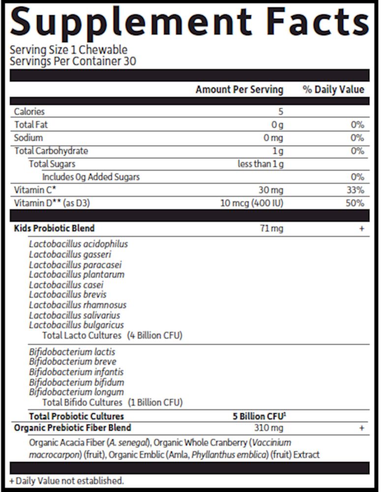 Dr. Formulated Probiotics Organic Kids+ is a Certified USDA Organic, Non-GMO Project Verified delicious chewable probiotic, with no added sugars or sweeteners, designed to build a healthy microbiome and support children’s digestive and immune health.*