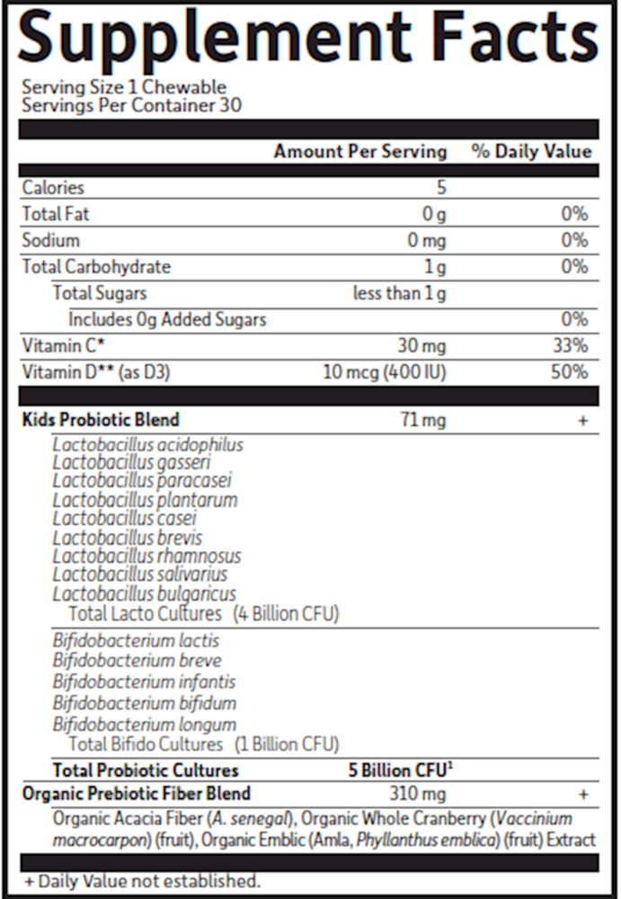 Organic Kids+—a unique Certified USDA, Non-GMO Project Verified Organic yummy chewable probiotic especially for kids to offer immune system and digestive support.*