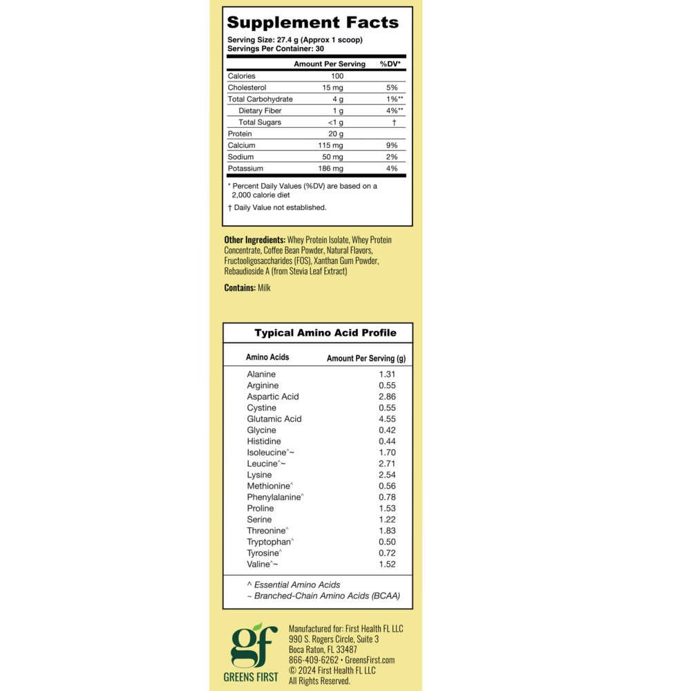 20g of Clean, Hormone Free, Complete Whey Protein; naturally flavored, no artificial flavors or sweeteners; smooth texture, great taste; sweetened with organic stevia leaf; non-GMO, gluten free, no added sugar, cGMP facility certified; low heat processed to keep nutrients in tact; contains FOS, a prebiotic fiber which can support gut health; contains all essential & non essential amino acids.*