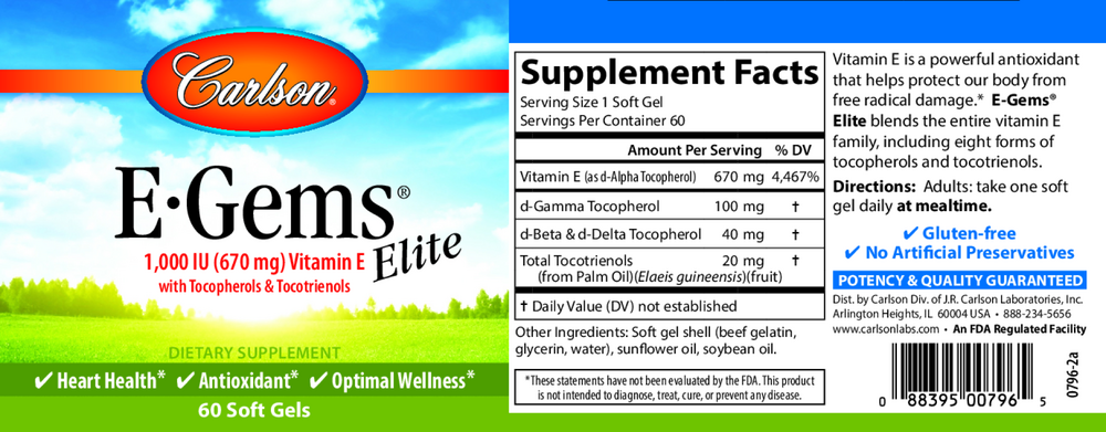 E-Gems® Elite 1,000 IU (670 mg) is an exclusive blend of the entire vitamin E family, including eight forms of tocopherols and tocotrienols. Vitamin E offers many health benefits and plays an important role in cardiovascular health and protecting our body from free radical damage.*
