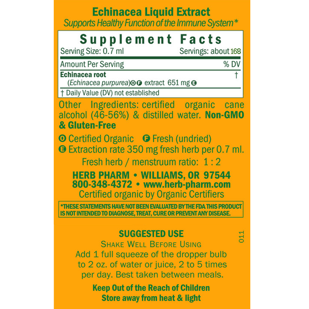 Herb Pharm Echinacea is extracted from the fresh (never dried) root of Certified Organic Echinacea purpurea plants grown on their own farms in southern Oregon. To assure optimal extraction of Echinacea’s bioactive compounds, they harvest the roots during the autumn and promptly extract them while still fresh and succulent.