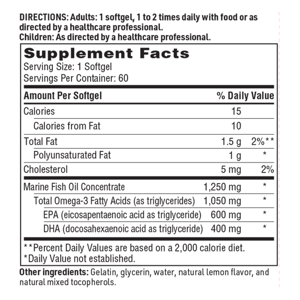 Eicosamax 1000 is a convenient once-daily omega-3 fatty acid supplement offering 1,000 mg eicosapentaenoic acid (EPA) and docosahexaenoic acid (DHA) in the natural, triglyceride form per soft gel. In addition to removing harmful toxins, compounds, and impurities that can contribute to a fishy taste, Eicosamax 1000 is molecularly distilled. Independent lab results consistently show that this processing technique delivers oils of exceptional quality and freshness. Natural mixed tocopherols are added as antioxidants, and natural lemon flavor is added to provide a clean, refreshing taste. To verify the product freedom from contaminants, each batch of Eicosamax 1000 is analyzed for potential environmental toxins by an accredited, third-party laboratory.