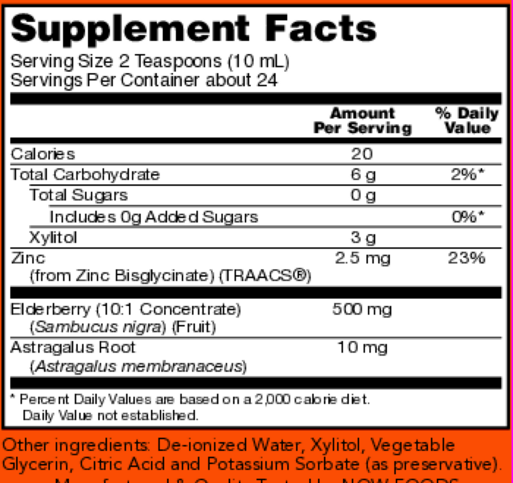 NOW® Elderberry Liquid for Kids combines elderberry concentrate with zinc and astragalus to promote seasonal wellness.* Elderberry has been used traditionally to maintain health and well-being.* Astragalus is an herbal ingredient that has been included to support a healthy immune system response to seasonal challenges.* Zinc has been added to promote normal immune system function.*