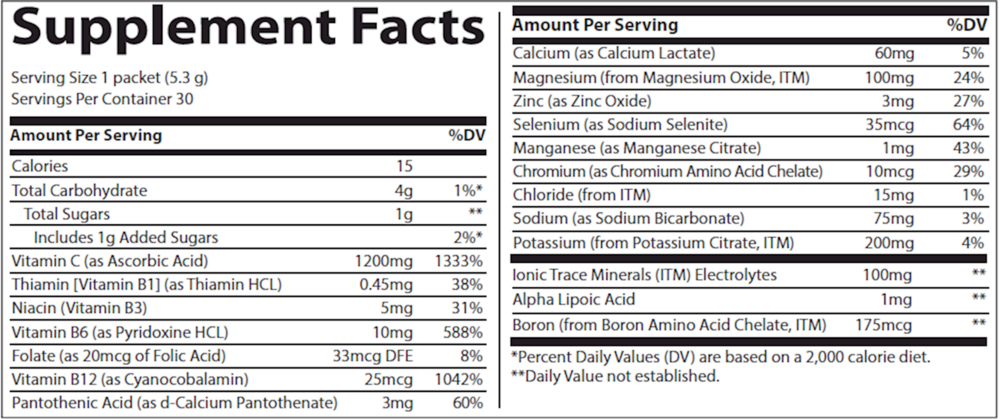 Electrolytes – Potassium, Sodium, Calcium, and Magnesium are essential electrolytes that help your body maintain hydration, prevent muscle cramps, and maintain energy and stamina.* It also includes an electrolyte concentrate of full spectrum trace minerals from seawater.