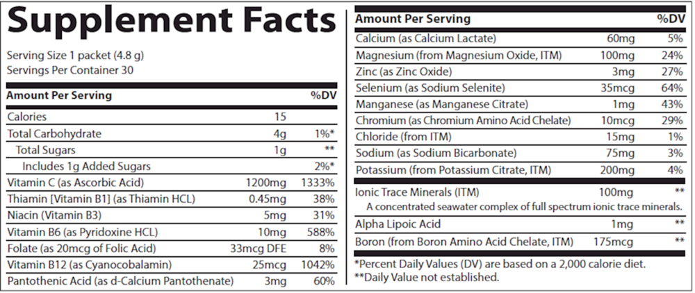 Electrolytes – Potassium, Sodium, Calcium, and Magnesium are essential electrolytes that help your body maintain hydration, prevent muscle cramps, and maintain energy and stamina.* It also includes an electrolyte concentrate of full spectrum trace minerals from seawater.