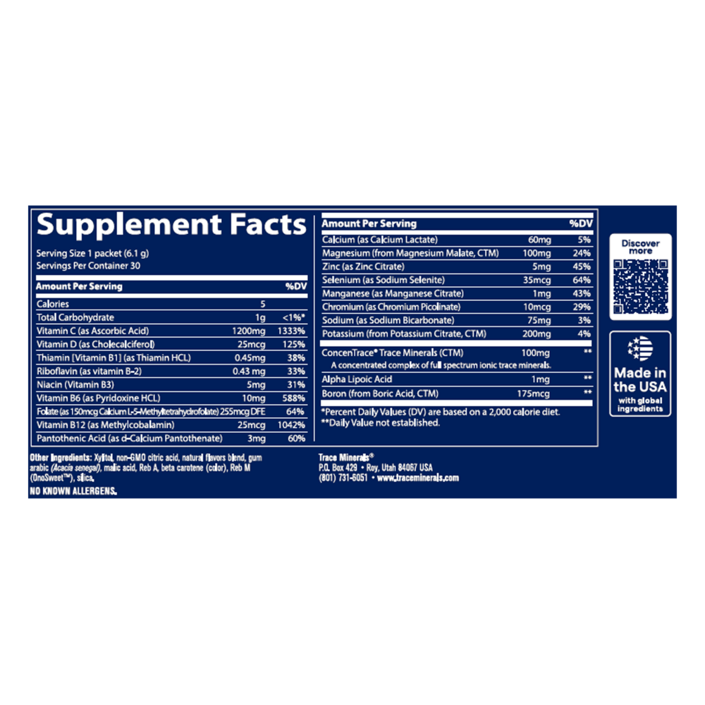 Power Up with PowerPak- Power Pak Electrolyte Packets are an easy-to-fix high performance energy drink with no caffeine, artificial flavors, or artificial stimulants. Each Trace Minerals Power Pak contains all major electrolytes (potassium, magnesium, chloride and sodium), plus a full spectrum of ionic trace minerals from ConcenTrace, which supports the assimilation and absorption of vitamins and nutrients.