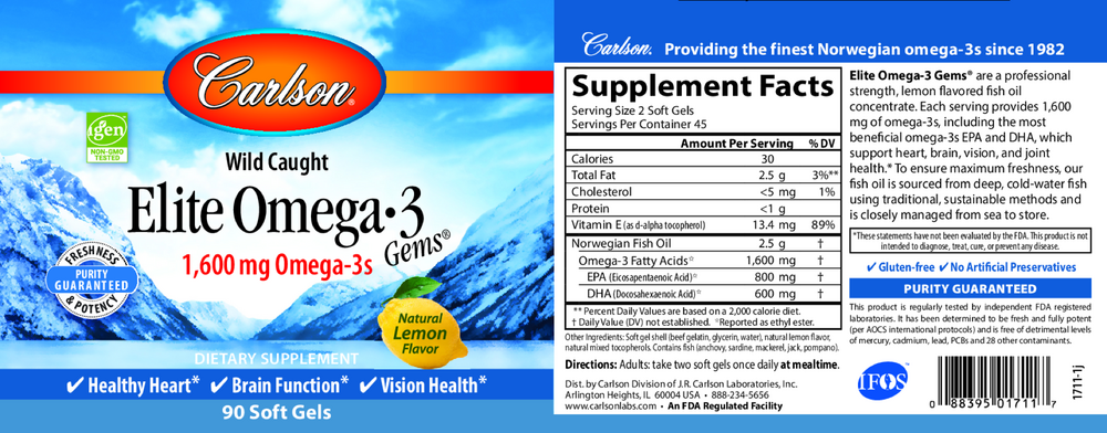 Carlson Elite Omega-3 Gems® is a professional-strength fish oil concentrate. A single serving provides 1,600 mg of omega-3s, including the important omega-3s EPA and DHA, which promote heart, brain, vision, and joint health.* To ensure maximum freshness, Elite Omega-3 Gems® is closely managed from sea to store. Carlson Labs sources the highest quality, deep, cold-water fish using traditional, sustainable methods. And like all Carlson omega-3s, freshness, potency, and purity are guaranteed.