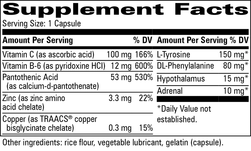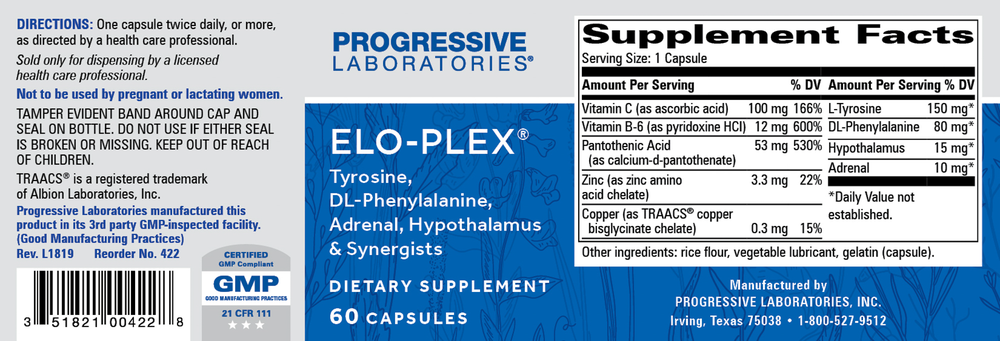 The nutrients in Elo-plex are important for the normal body protection of adrenal cortex hormones (corticosteroids), adrenal medulla hormones (adrenalin and noradrenalin) and brain synthesis of catecholamine.*