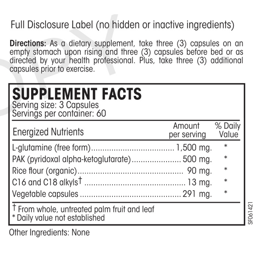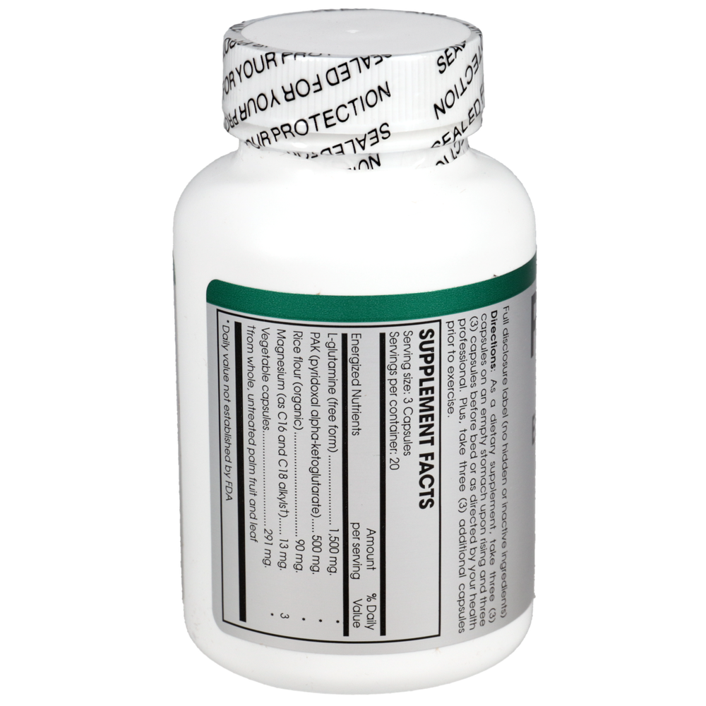 Fact: Patented combination of l-glutamine and pyridoxal alpha-ketoglutarate (PAK), a unique compound that naturally recycles l-glutamine, which allows for more efficient utilization of glutamine and prevents build-up of glutamate.*