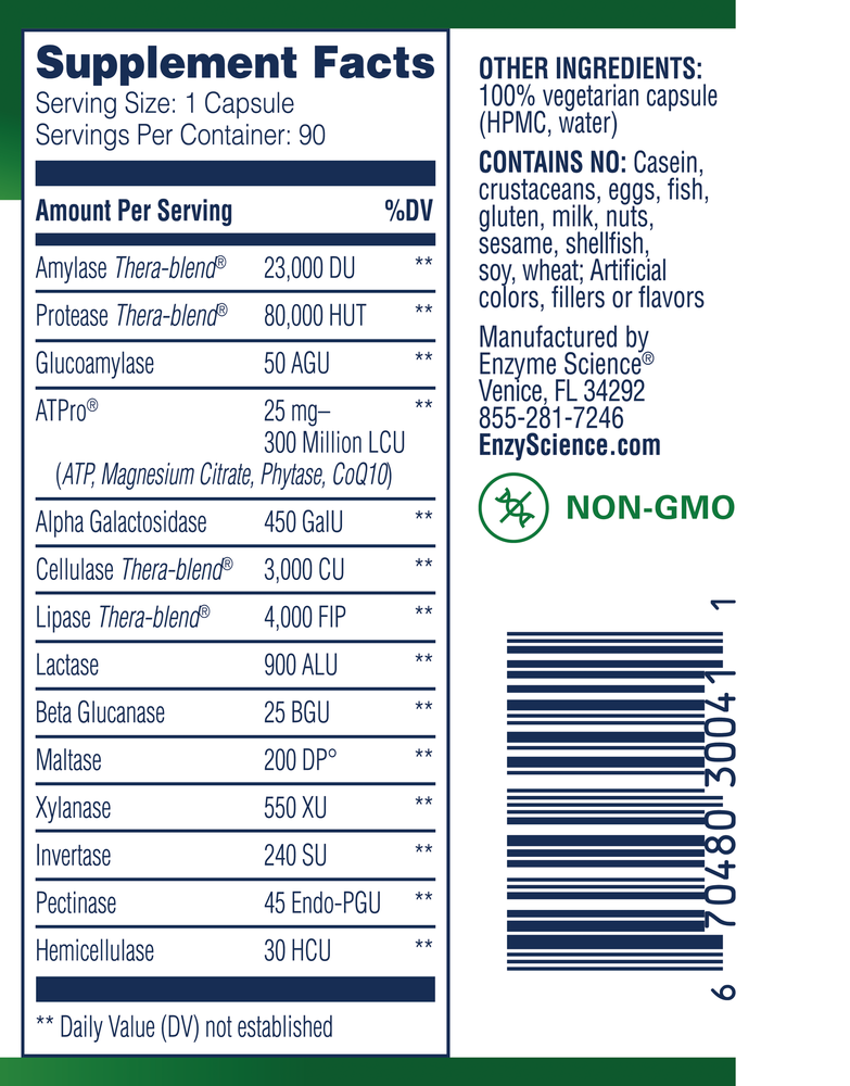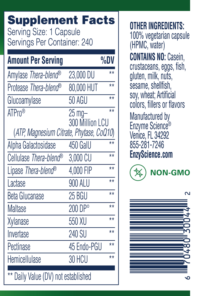 Digest Gold™ is formulated to contain ATPro™- ATP, magnesium, phytase and CoQ10. ATP is used to power energy-requiring cellular or enzymatic reactions and is vital for encouraging digestive health.* Enzyme Science also formulates each enzyme focused product with exclusive Thera-blend enzymes. The Thera-blend process is scientifically designed to provide optimal solutions for digestive health and wellness. These unique protease, amylase, cellulase and lipase enzymes are comprised of multiple variants which are blended to work synergistically throughout the broad pH range of the human body.