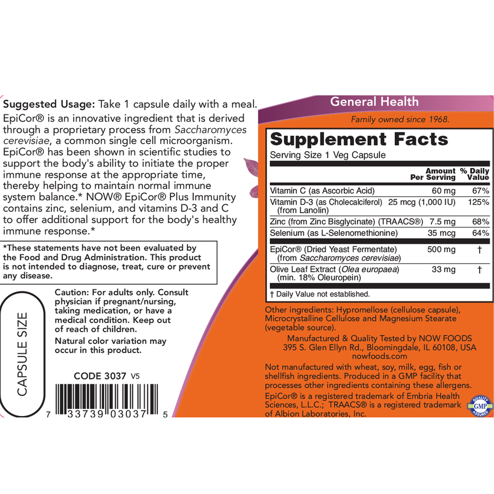 EpiCor® is an innovative ingredient that is derived through a proprietary process from Saccharomyces cerevisiae, a common single cell microorganism. EpiCor® has been shown in scientific studies to support the body's ability to initiate the proper immune response at the appropriate time, thereby helping to maintain normal immune system balance.* NOW® EpiCor® Plus Immunity contains zinc, selenium, and vitamins D-3 and C to offer additional support for the body's healthy immune response.*