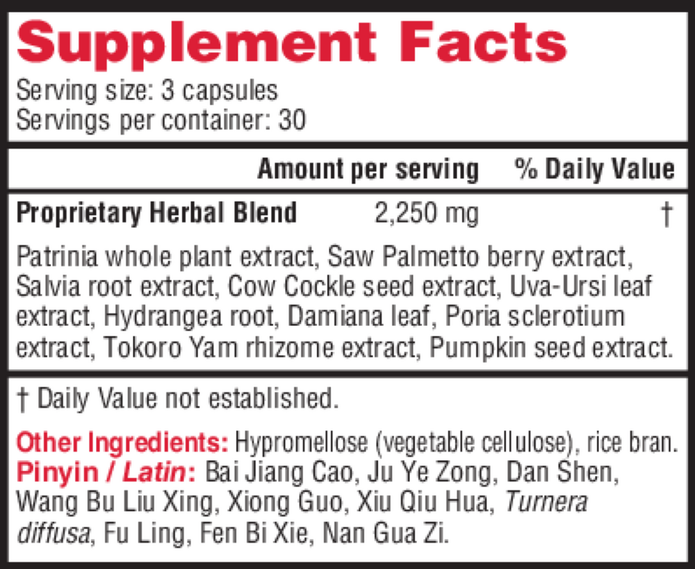 Suggested Use: Take three capsules, 3 times per day between meals, or as recommended by your health care practitioner. Serving Size: 3 capsules Amount Per Serving Proprietary Herbal Blend … 2,250 mg Patrinia herb (bai jiang cao), Saw Palmetto fruit concentrate (Serenoa repens), Salvia root (dan shen), Vaccaria seed (wang bu liu xing), Liquidambar fruit (lu lu tong), Hydrangea fruit (Hydrangeae arborscentis), Damiana leaf (Turnerae aphrodisiacae), Poria sclerotium (fu ling), Tokoro rhizome (bi xie), Abutilon seed (dong kui zi). Other Ingredients: Hypromellose (vegetable cellulose), rice bran.