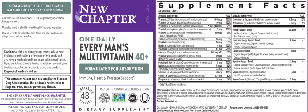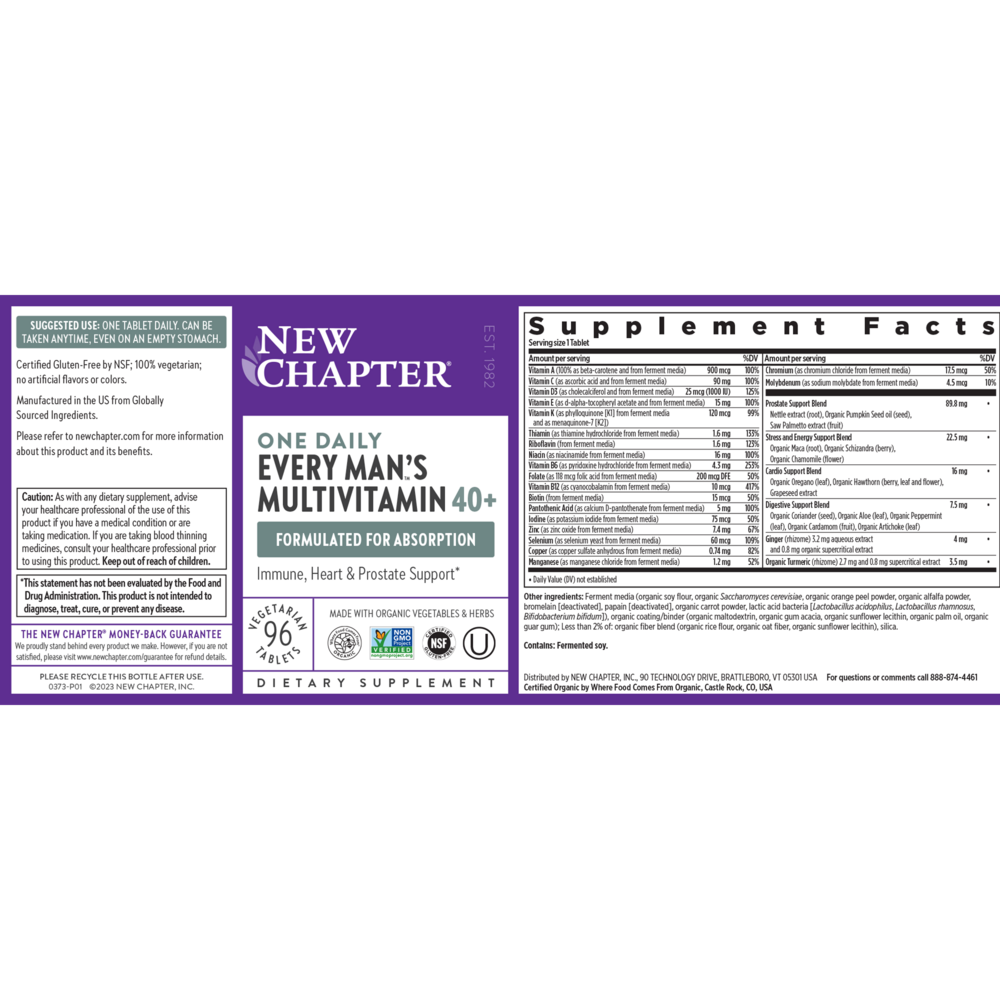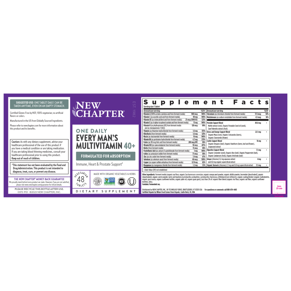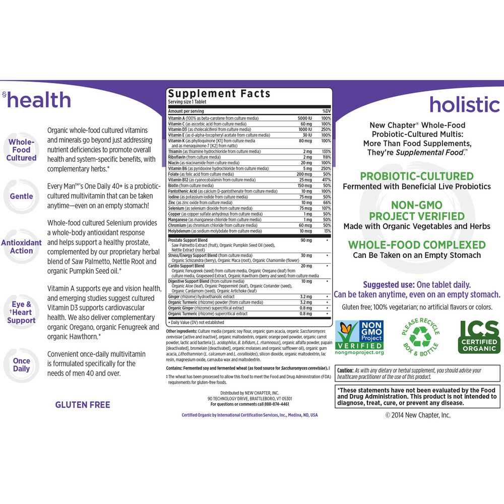 If you're looking for the right multivitamin for men over 40, New Chapter has got you covered with this one-daily, nutrient-packed formula for energy support, immune, heart, eye, and prostate health, and so much more.* Enhance your overall wellness with essential vitamins and minerals fermented with probiotics, and formulated for your body to recognize and absorb as food. Our easily digestible multivitamins for men 40 plus are gentle even on an empty stomach. Here at New Chapter, we sustainably source the highest quality ingredients and craft with you and our planet in mind. We do all this, so you can do you. That’s wellness, well done. *These statements have not been evaluated by the Food and Drug Administration. This product is not intended to diagnose, treat, cure or prevent any disease.