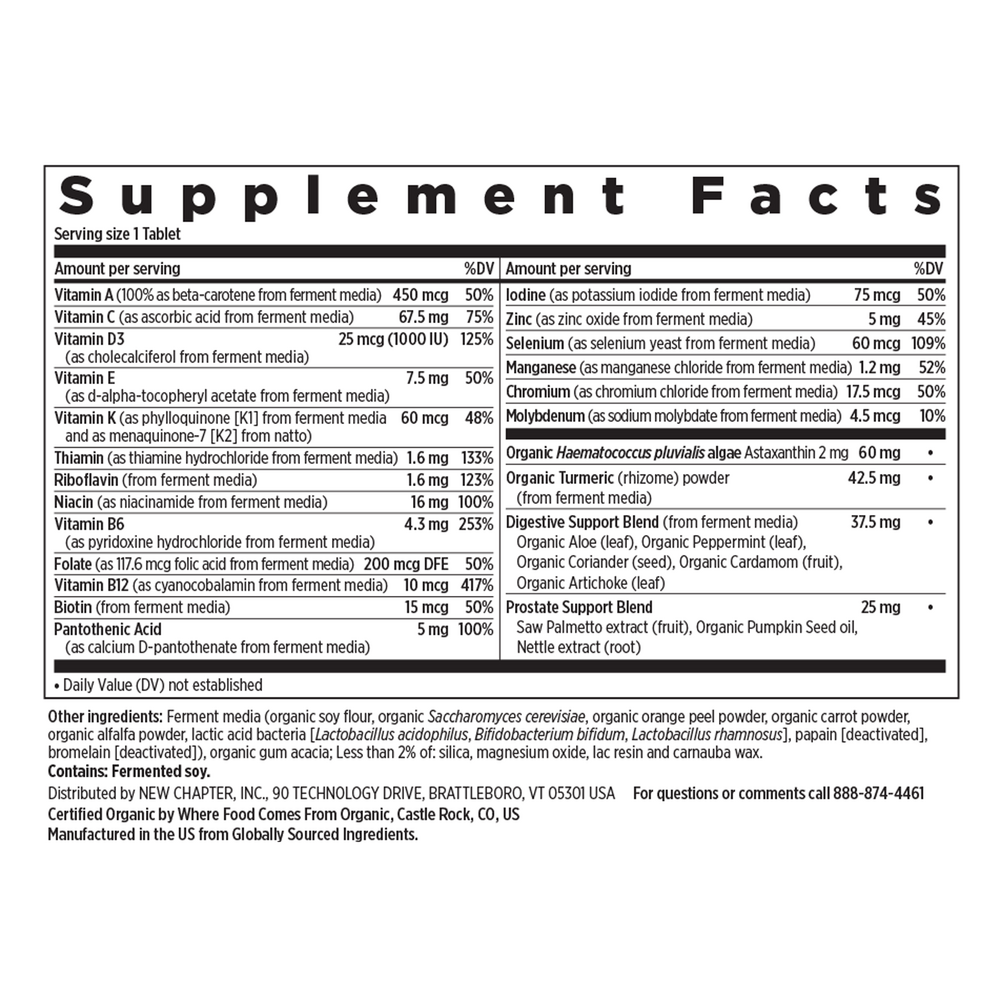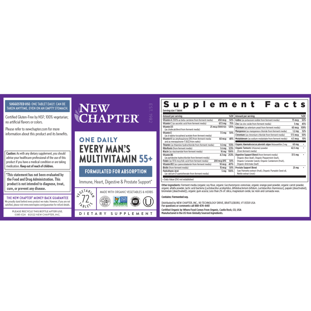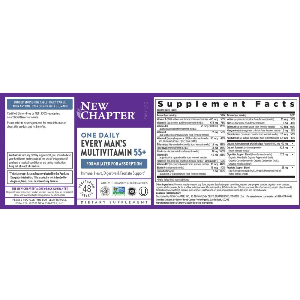 You’re getting better with age, and looking forward to years of continued well-being. New Chapter's complete one-daily multivitamin for men 50 plus is expertly designed for you, packed with nutrients for immune, cellular energy, brain, bone & prostate health support, stress, mood, vision & digestive support, and healthy hair, skin & nails.* Enhance overall wellness and healthy aging with essential vitamins and minerals fermented with probiotics, and formulated for your body to recognize and absorb as food. Easily digestible and gentle even on an empty stomach! Here at New Chapter, we sustainably source the highest quality ingredients and craft with you and our planet in mind. That's what we call wellness, well done. IRON-FREE. *These statements have not been evaluated by the Food and Drug Administration. This product is not intended to diagnose, treat, cure or prevent any disease.