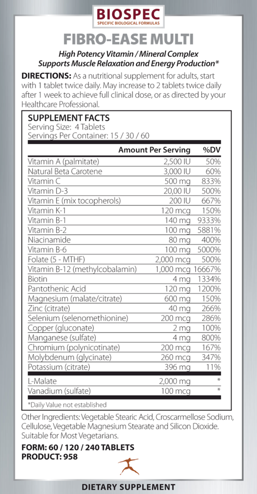 Fibro-Ease Multi is a complete, highly specialized vitamin/mineral formula designed to support muscle relaxation and energy production*