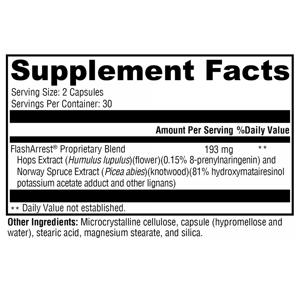 FlashArrest® delivers a unique, proprietary blend of 8-prenylnaringenin (8-PN) from hops and plant-lignin extract at clinically relevant levels. Research suggests lignans and 8-PN can support the body’s natural process of healthy aromatase activity and exert phytoestrogen (e.g., enterolactone) and antioxidant activity. This all-natural formula may support cardiovascular, bone, breast, and prostate health and help relieve normal menopausal discomforts.*