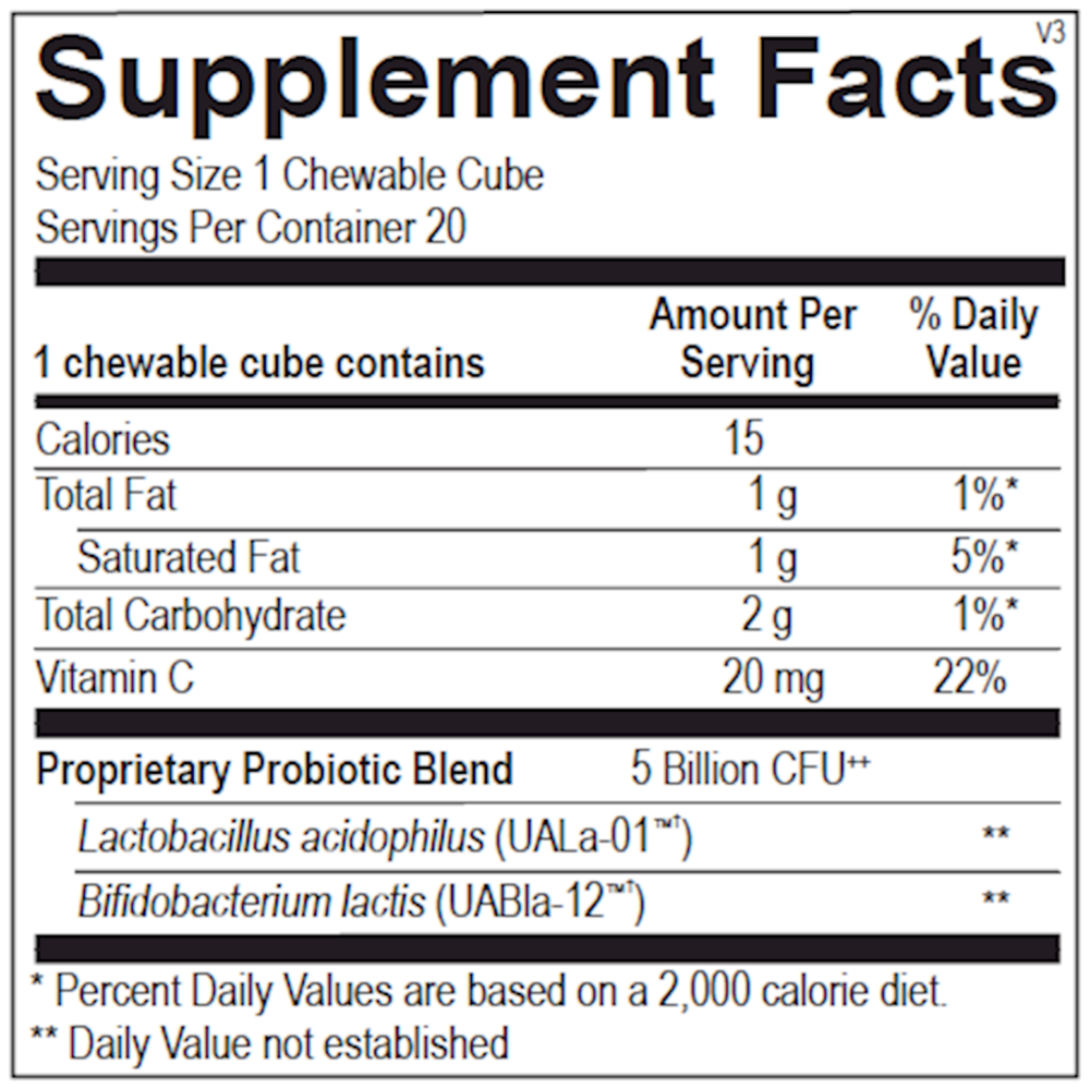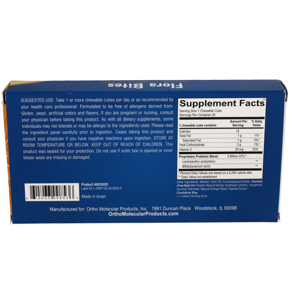 Flora Bites is a delicious, chewable probiotic formula for children, designed to promote healthy gut microflora, protect intestinal integrity and support immune function. Each creamy, natural orange-flavored cube contains a 5 billion CFU blend of Lactobacillus acidophilus and Bifidobacterium lactis, as well as 20 mg of vitamin C for comprehensive digestive and immune system support.* The strains in Flora Bites have been carefully selected for their survivability and adherence to the intestinal tract. The chewable cube form is an easy, fun way for children to achieve optimal probiotic support and a tasty alternative to a capsule or powdered probiotic.