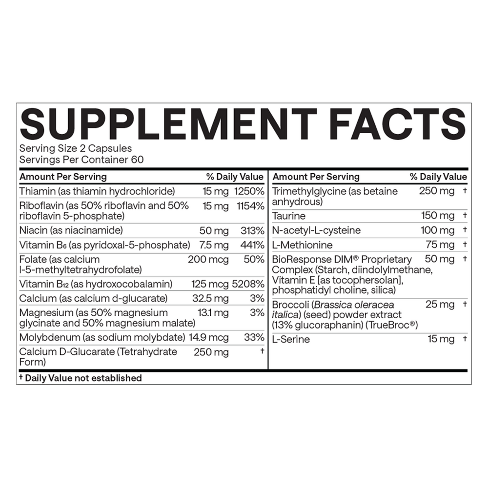 A comprehensive detox formulation designed to enhance all phases of estrogen detox (phases 1, 2 and 3). The use of di-indol-methane (DIM) supports phase 1 detox, while estrogen methyl factors, sulfation support and biliary conjugation are enhanced with herbs like milk thistle and broccoli sprout, and nutrients including taurine, serine and tri-methylglycine.