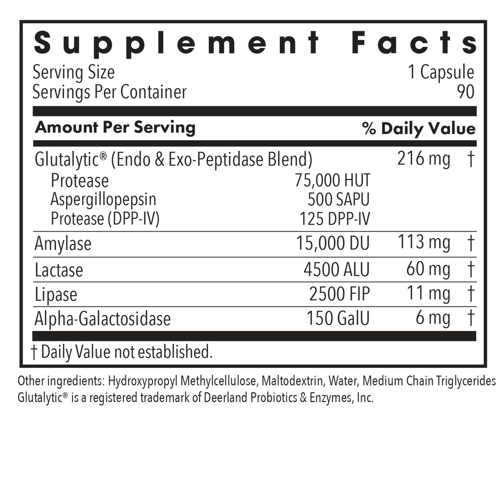 Full spectrum vegan enzyme blend, including Glutalytic®, lactase, lipase, alpha-galactosidase, and amylase, to assist breakdown of gluten, gliadin, casein, whey, lactose, protein, fats, and carbohydrates.*