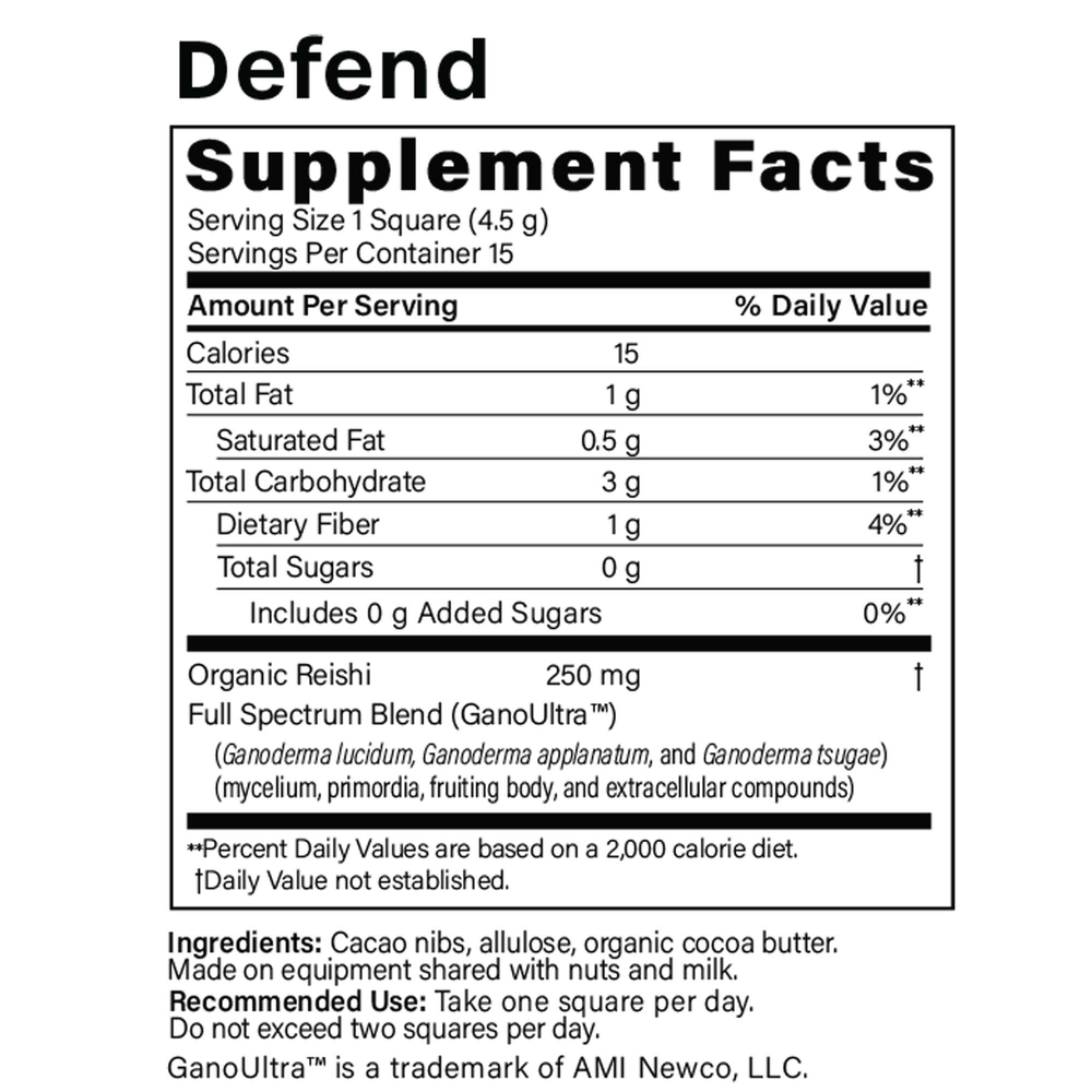 Fx Chocolate® Defend contains 250 mg of GanoUltra™ — three individually extracted strains of full-spectrum organic reishi mushrooms (Ganoderma lucidum, Ganoderma applanatum, and Ganoderma tsugae). GanoUltra™ is revered for sustained energy, mind, and body-balancing properties.*