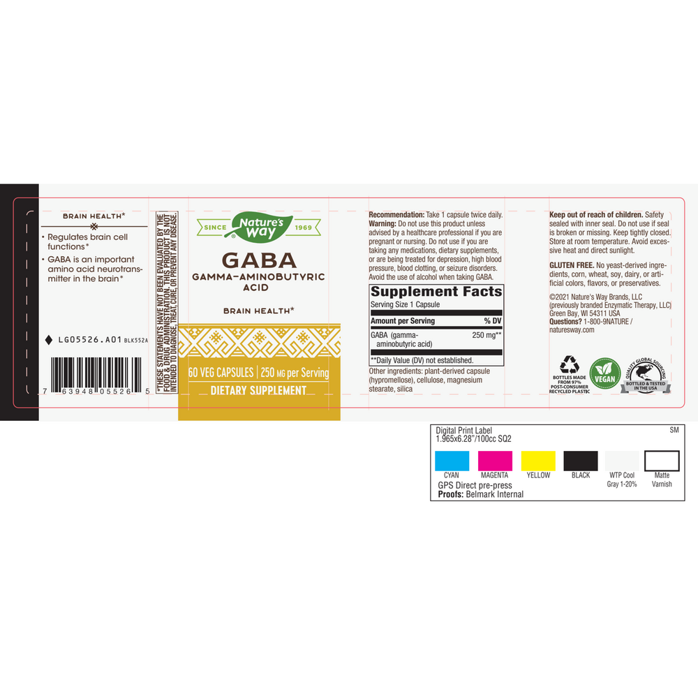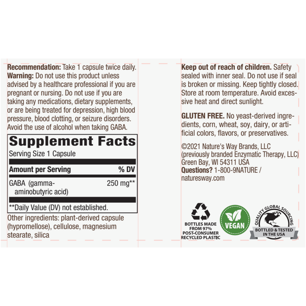 Recommended Use: Take one (1) capsule twice daily. Serving Size: 1 Capsule Amount Per Serving GABA … 250mg** Gluten Free. Vegan. Does not contain yeast-derived ingredients, corn, wheat, soy, dairy, or artificial colors, flavors, or preservatives.