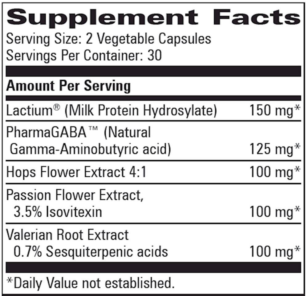 Gamma Amino Butyric Acid (GABA) is an amino acid neurotransmitter in the central nervous system which, when taken with niacinamide and inositol, supports relaxation and calmness. Vitamin B-1 (thiamine) supports a healthy nervous system and positive mental attitude. Magnesium is necessary for proper functioning of nerves, muscles and neuromuscular contractions. Glutamic Acid is used as fuel by the brain. Synergistic herbs (valerian root, hops pollen and passion flower) are added to support calmness and relaxation in various parts of the body. Brain tissue provides growth and repair factors for weak or exhausted brain cells and has a balancing effect.*
