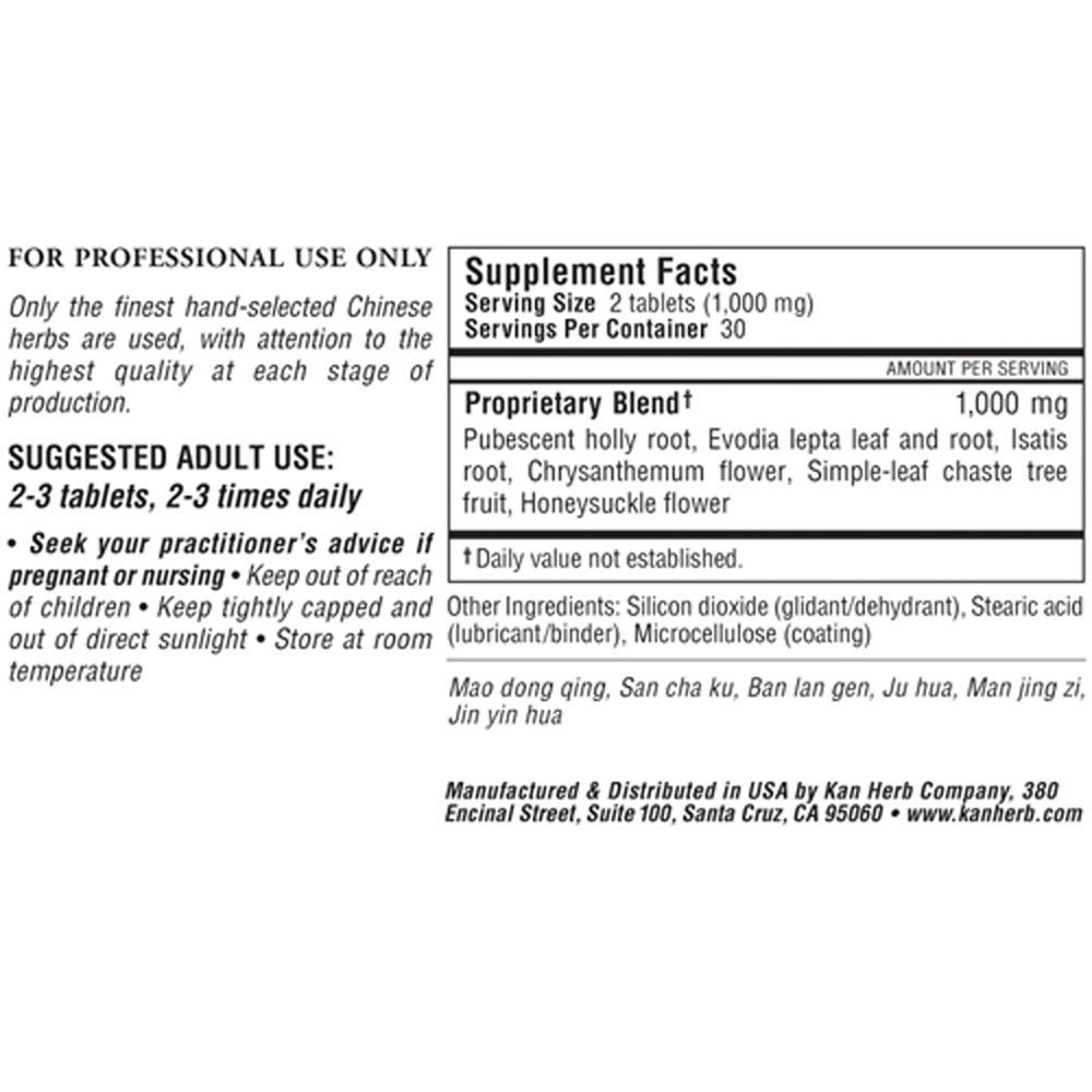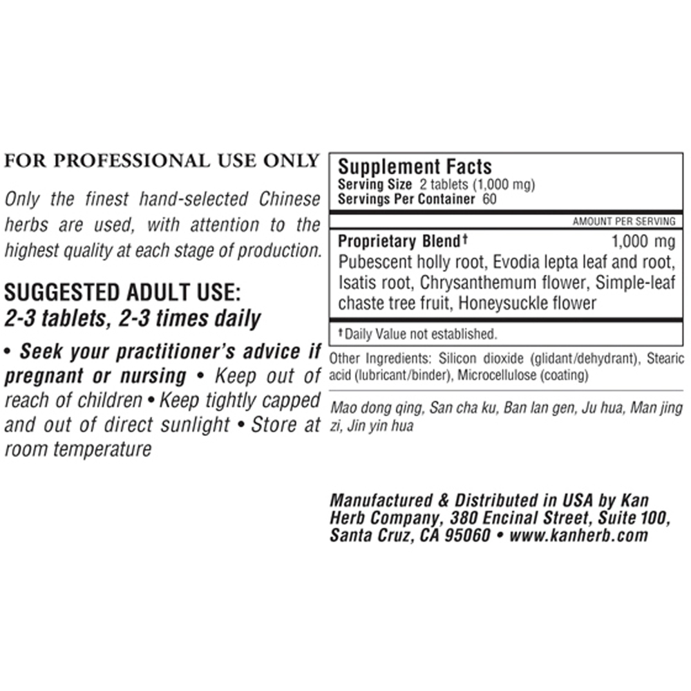 Ingredient Quantity ban lan gen - Gan Cao - Jin yin hua - Ju hua - Man jing zi - Mao dong qing - San cha ka -Serving size: 2 Tablet
