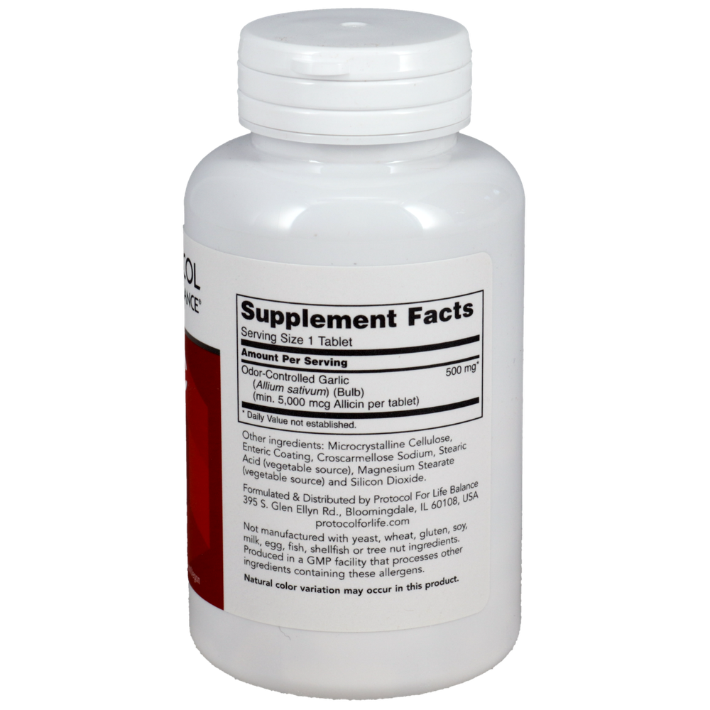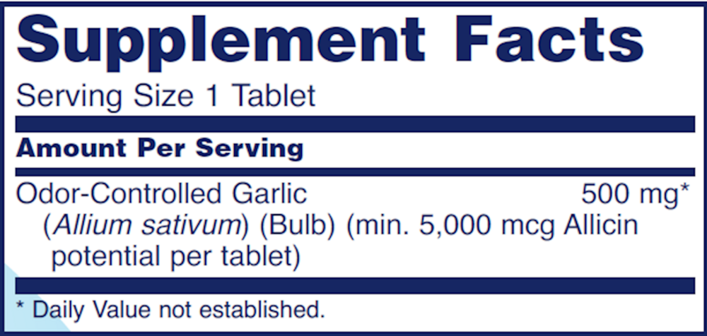 Garlic 5000 is standardized to yield allicin precursors, which convert to allicin when ingested. It is enteric coated so that this conversion occurs in the upper intestine for optimal absorption, as well as to contain the release of garlic’s pungent odor. The allicin potential of this product is achieved through a special process that keeps Garlic’s moisture low while preserving all of the natural goodness of whole fresh garlic. Enjoy the benefits of this odor-controlled garlic tablet!