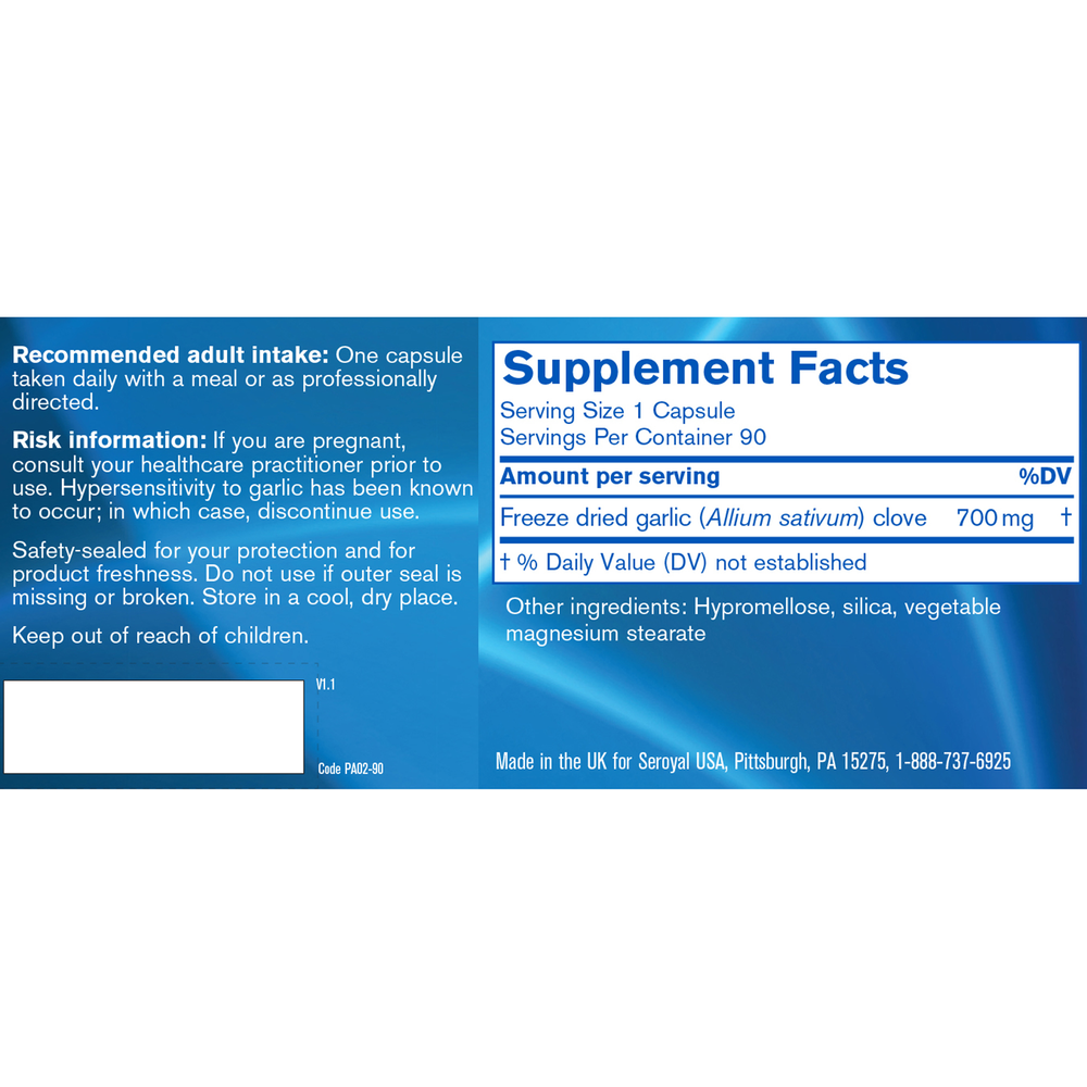Garlic Freeze Dried provides 700 mg of garlic clove (Allium sativum) per day. Garlic is traditionally used in Herbal Medicine to support healthy upper respiratory tract health and to promote already normal blood lipid levels.* It has also been used traditionally to help maintain cardiovascular health in adults.*