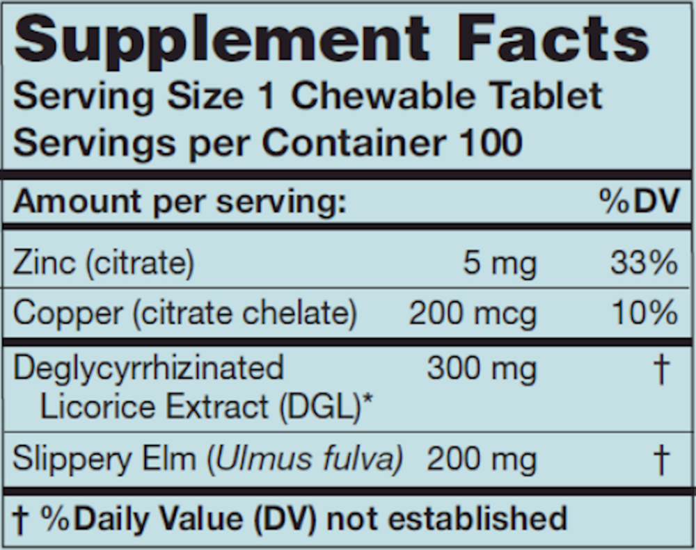 Symptoms of upper gastrointestinal discomfort are among the most common patient complaints. Deglycyrrhizinated licorice (DGL) is rich in flavonoids and chalcones, among other constituents, that favorably yet safely support mucosal health by a number of mechanisms. Slippery elm bark contains a mucilage component with soothing properties ideally suited for heping protect the tissues of the upper gastrointestinal tract. Zinc has several functions essential for healing disturbed tissues, including those of the upper digestive tract.* These ingredients are combined in a pleasant-tasting chewable tablet, since capsules do not allow the development of the soothing coating action required for maximal effectiveness.