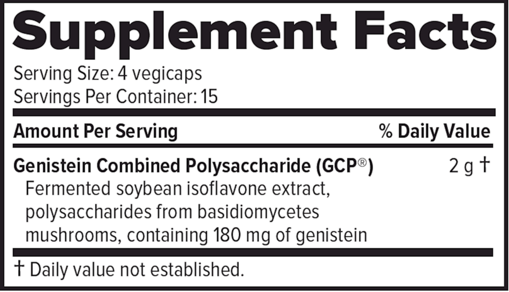 GeniKinoko contains GCP (Genistein Combined Polysaccharide), a unique compound rich in soy isoflavone aglycones, which provides a particularly potent source of highly bioavailable genistein and mushroom polysaccharides.