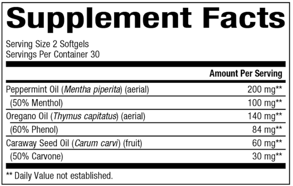 Provides clinically effective amounts of peppermint, caraway, and oregano oils.