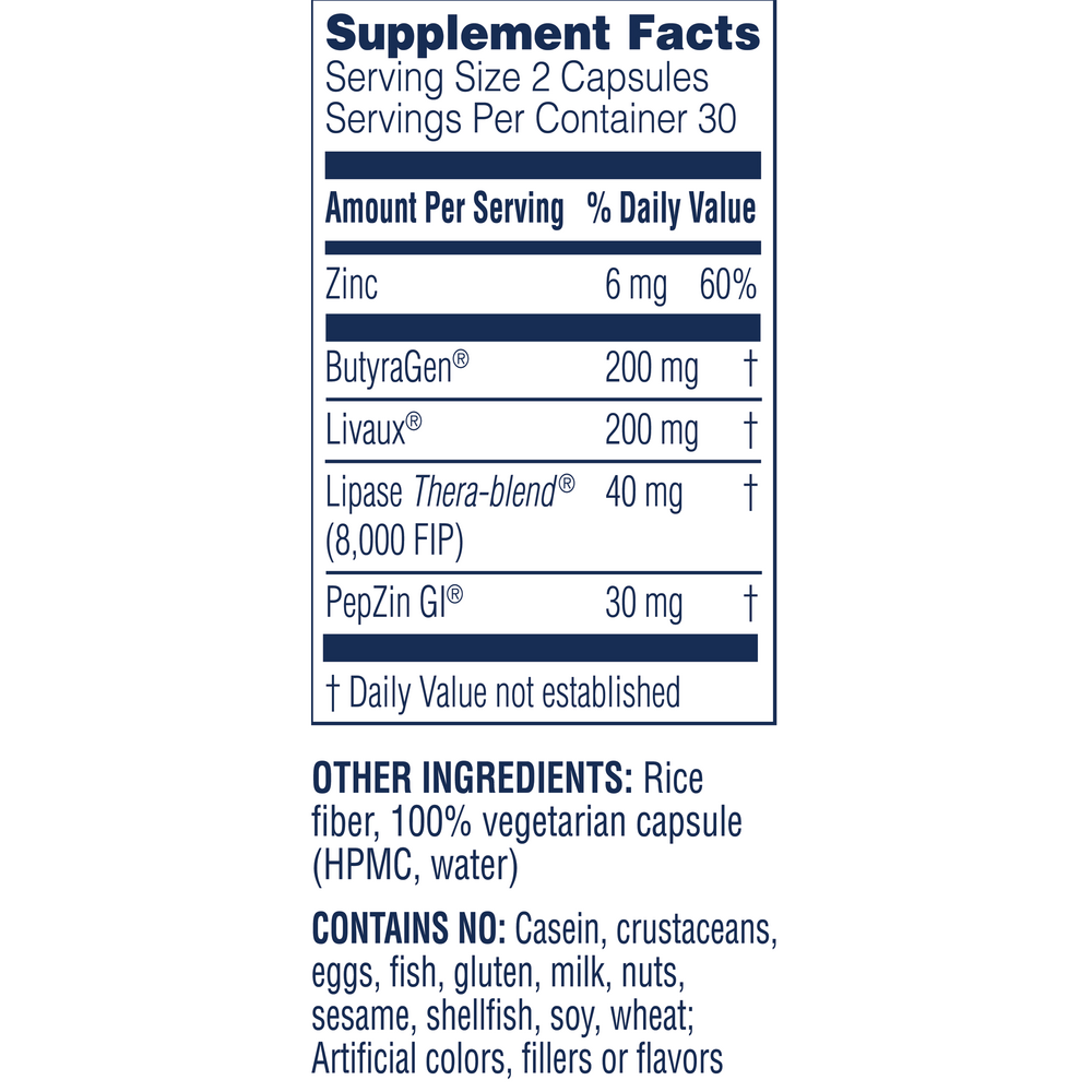 With the scientifically studied ButyraGen® (with tributyrin and fiber), Lipase Thera-blend®, PepZinGI® zinc carnosine and Livaux® organic golden kiwi.