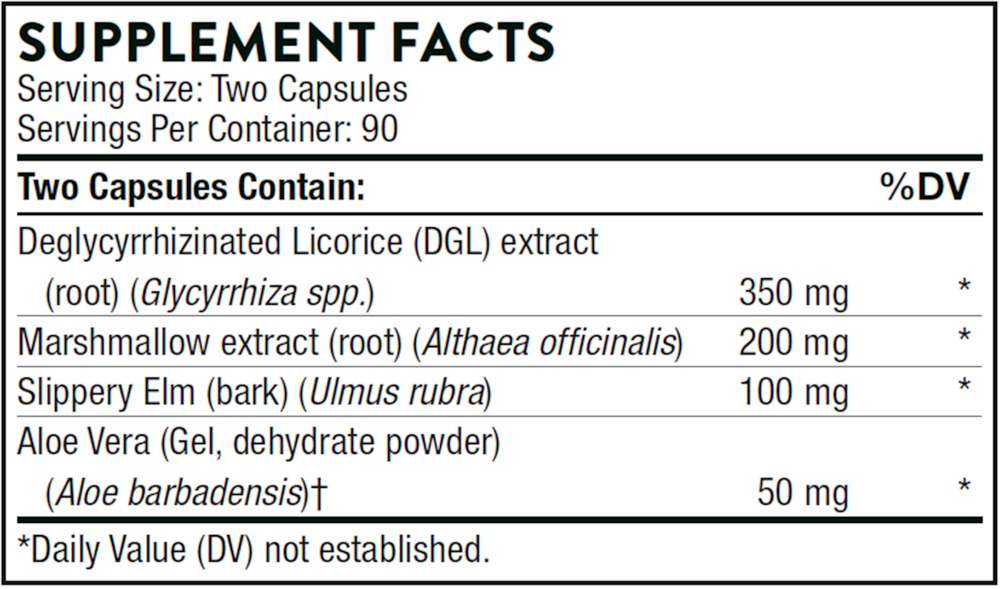 Similarly, licorice root preparations, which support the stomach and duodenum,* can cause blood pressure to rise in some individuals when given in higher amounts. Therefore, the licorice in GI-Relief has had its glycyrrhizin removed, which prevents increases in blood pressure.* GI-Relief also contains slippery elm bark (Ulmus rubra) and marshmallow root (Althea officinalis), both of which contain mucilaginous components that can help soothe the digestive tract.* GI-Relief can be taken out of the capsule and mixed with warm water to drink as a tea.*
