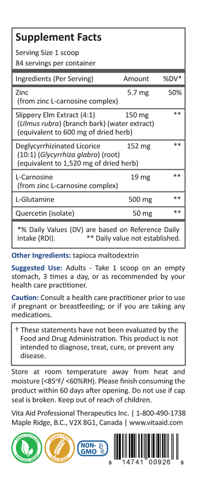Comprehensive gut-support formula.*GI-Restore® is a comprehensive formula to support the lining of the gut via multiple mechanisms.*• Supports intercellular tight junctions.*• Supports mucus secretion in the stomach.*• Helps coat gut linings to soothe and protect.*• Supports proper tissue formation and regeneration.*Key features:• Polaprezinc (Zinc L-Carnosine) helps to protect intercellular tight junctions.*• Combination of herbal ingredients DGL (10:1) and Slippery Elm (4:1 water extract) to coat and soothe GI linings.*• L-glutamine to support tissue regeneration in the GI tract.*• Quercetin for support of normal, healthy histamine and inflammation responses in the gut.*• GI-Restore®: Contains S-methylmethionine from Cabbage juice concentrate to help protect GI mucosa.*• Powder form to ensure contact throughout the entire GI tract.