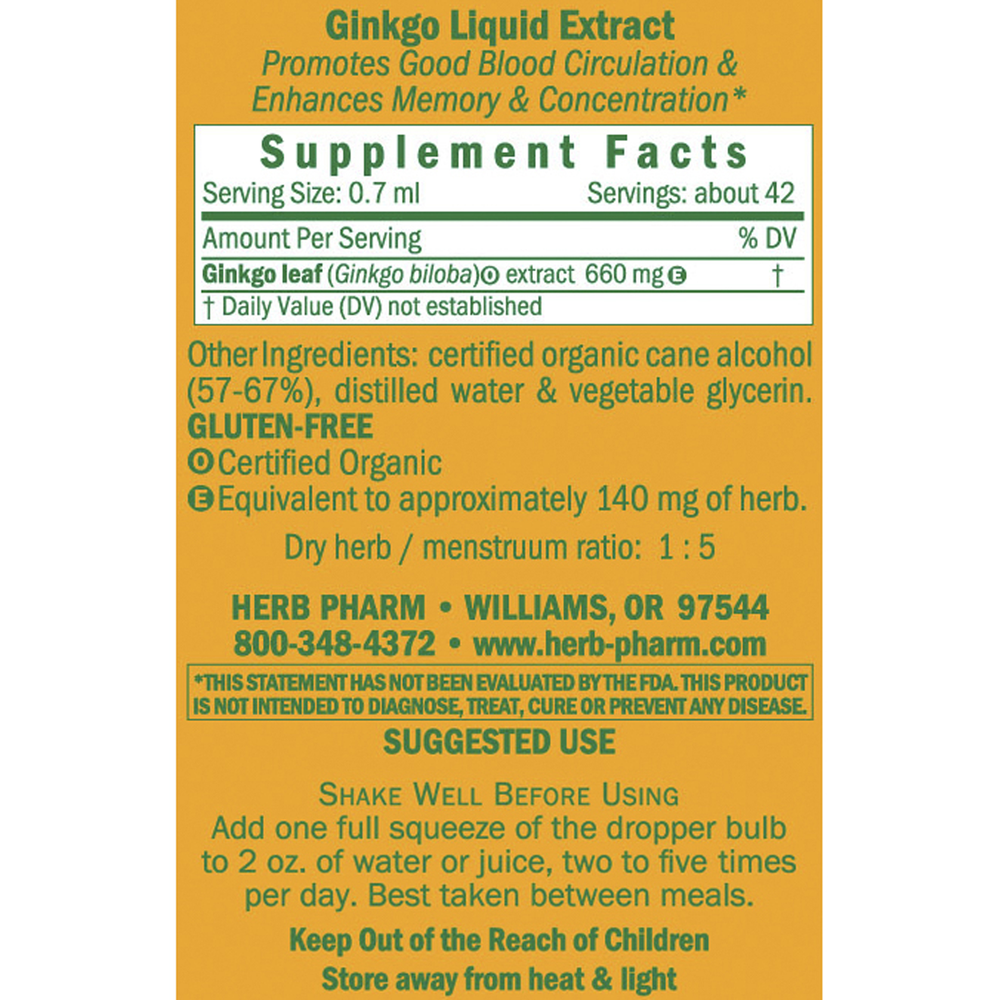 Herb Pharm prepares their Ginkgo extract from the whole green leaves of domestic-grown Certified Organic Ginkgo biloba trees. Mature leaves are plucked from the trees before they yellow, then milled at the last minute before extraction.
