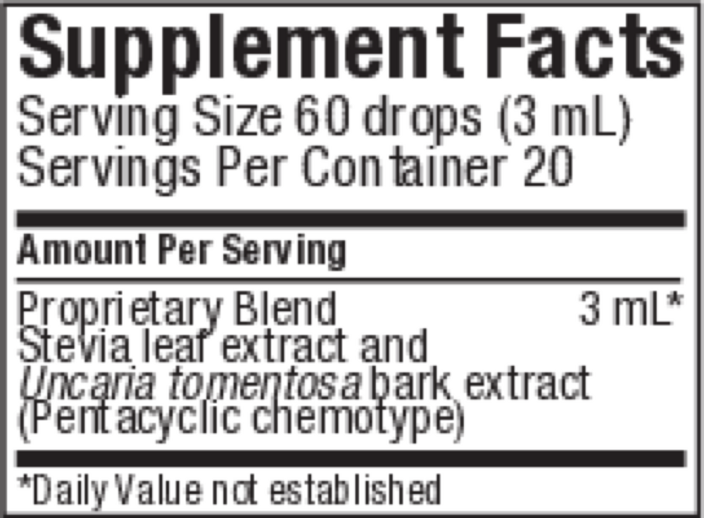 Ingredient Quantity Proprietary Blend 3 mL Stevia Leaf Extract - Uncaria tomentosa bark extract - Other Ingredients: mineral water, ethanol (20-24%).Serving size:  60 Drop