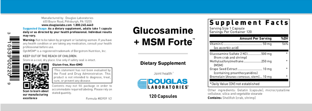 Glucosamine MSM Forte™ capsules contain 500 mg of pure glucosamine sulfate and 250 mg of methylsulfonylmethane (MSM). Ascorbic acid and bromelain are also included to provide additional aid in maintaining the health of aging joints. Individual results may vary.*
