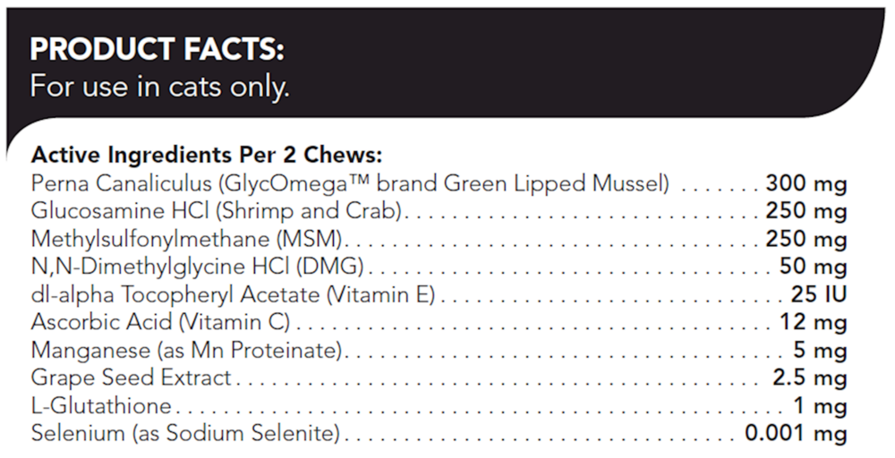 VetriScience® Laboratories’ GlycoFlex® 3 Feline Bite-Sized Chews combines the powerful benefits of Perna canaliculus with other ingredients for joint support, such as glucosamine, MSM, manganese, and VetriScience Laboratories’ patented DMG. Formulated for serious joint support for cats, GlycoFlex 3 Feline Bite-Sized Chews are available in a highly palatable chicken liver flavored chew.